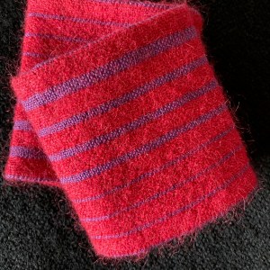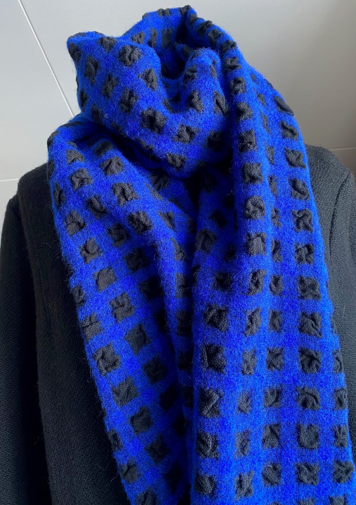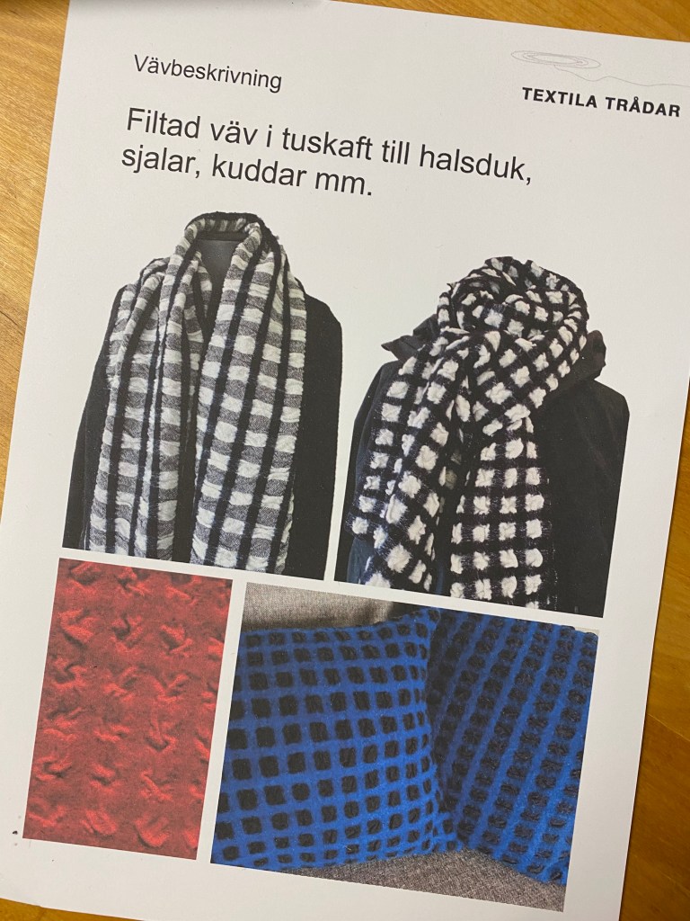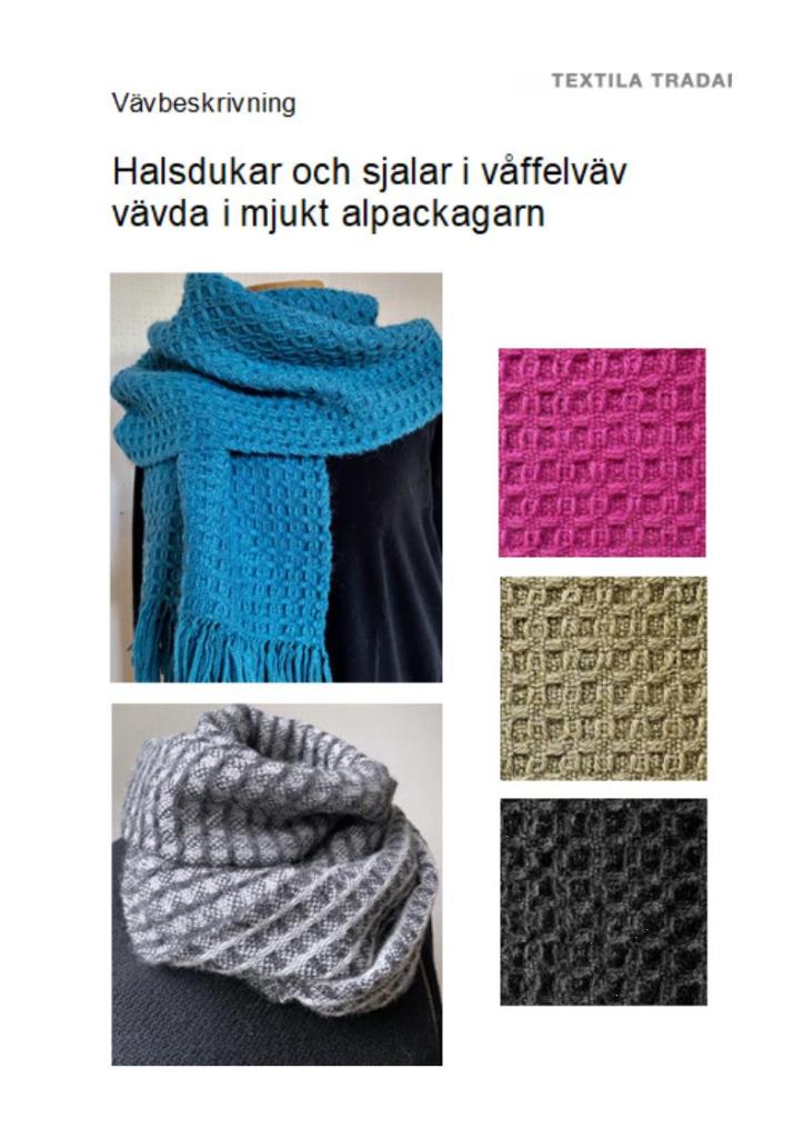 Väven har en mjuk och behaglig känsla och blir lika fin till en smal halsduk som till en bredare halsduk eller sjal. Våffelbindningen vävs på 4 skaft och med 5 eller 7 trampor. Den grå halsduken har en bindning som ger lite mindre struktur och vävs med bara 4 trampor.
