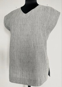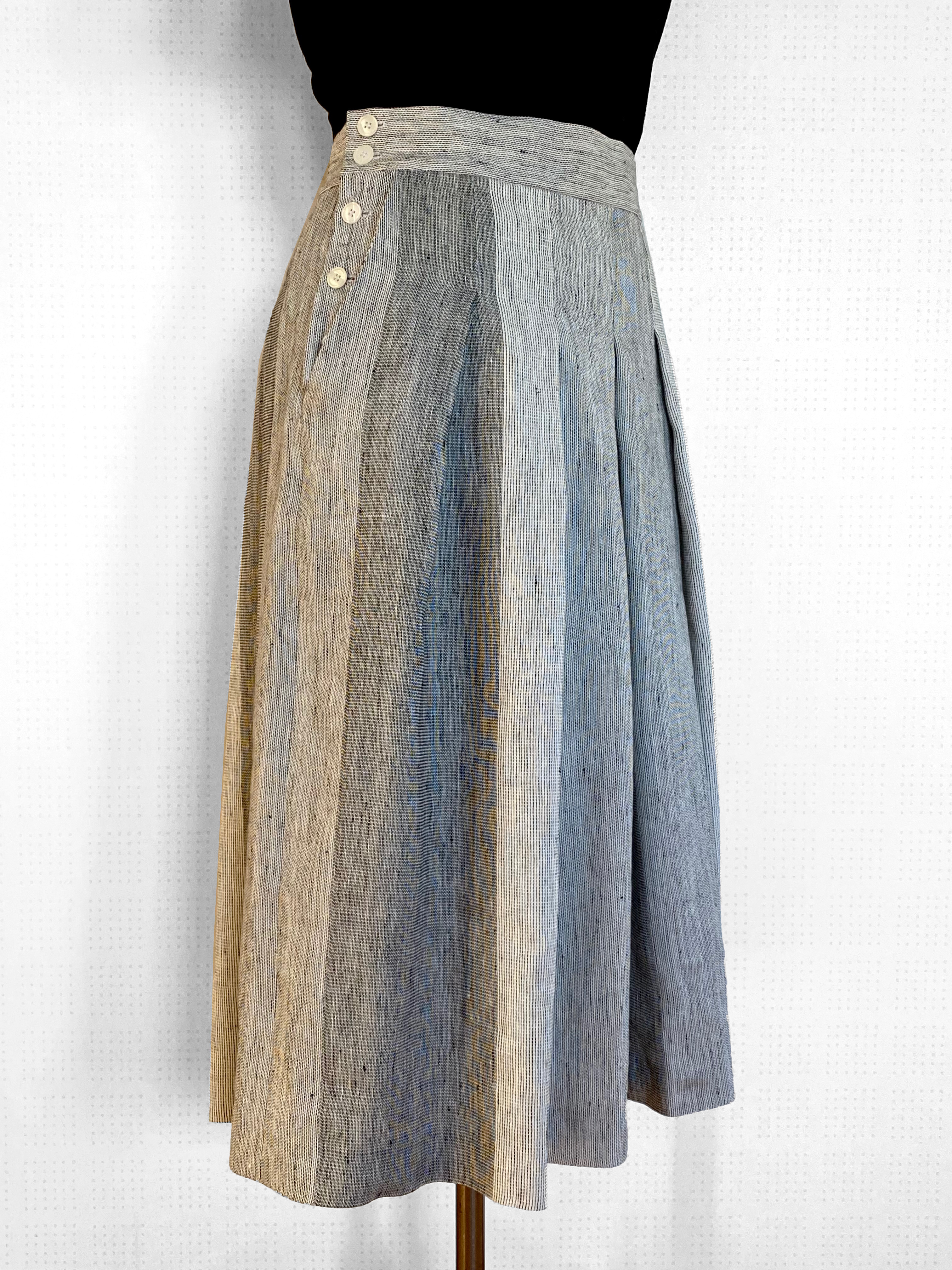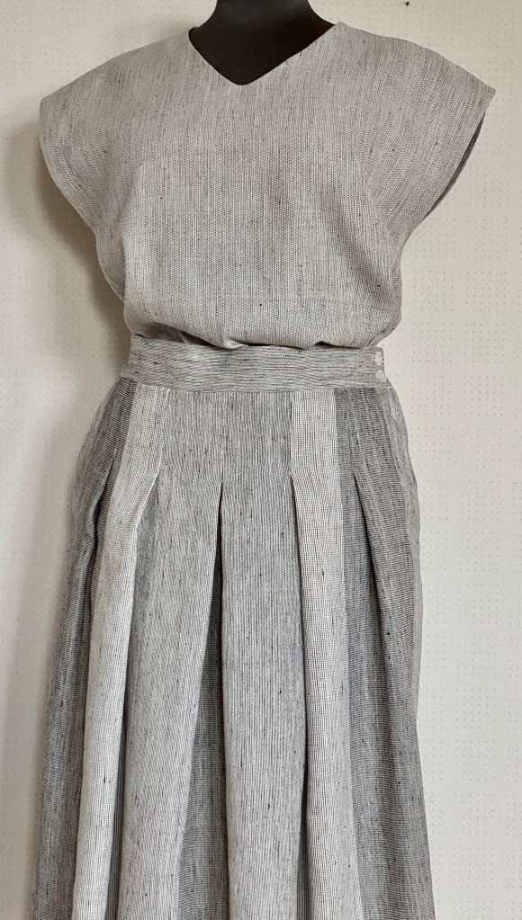 Ett tyg i tunt bomulls- och lingarn till sommarkjol med vidd. Tyget passar också bra till en lättare klänning, tunn top eller linne. Tyget har en lätt kvalité med mjukt fall och passar inte så bra till slitvaror. Jag har använt tygets inslagsriktning till plaggets längdriktning för att få bästa fallet. Tyget är vävt på 4 skaft.